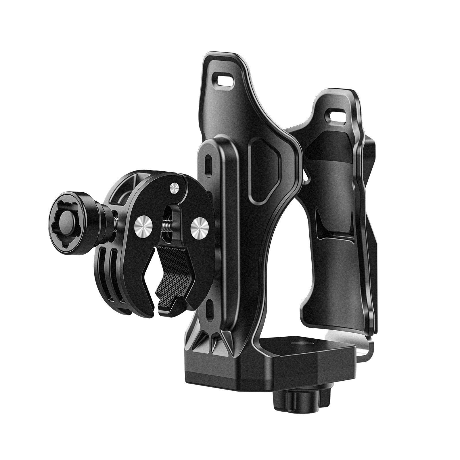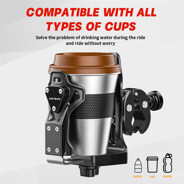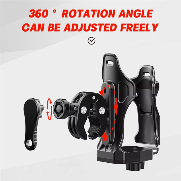 The holder features a full 360° rotational design, allowing the bottle to be positioned at any angle for optimal comfort and accessibility. An adjustable clamp accommodates bottles from 50mm to 90mm in diameter, making it compatible with most water bottles, flasks, and drink containers.